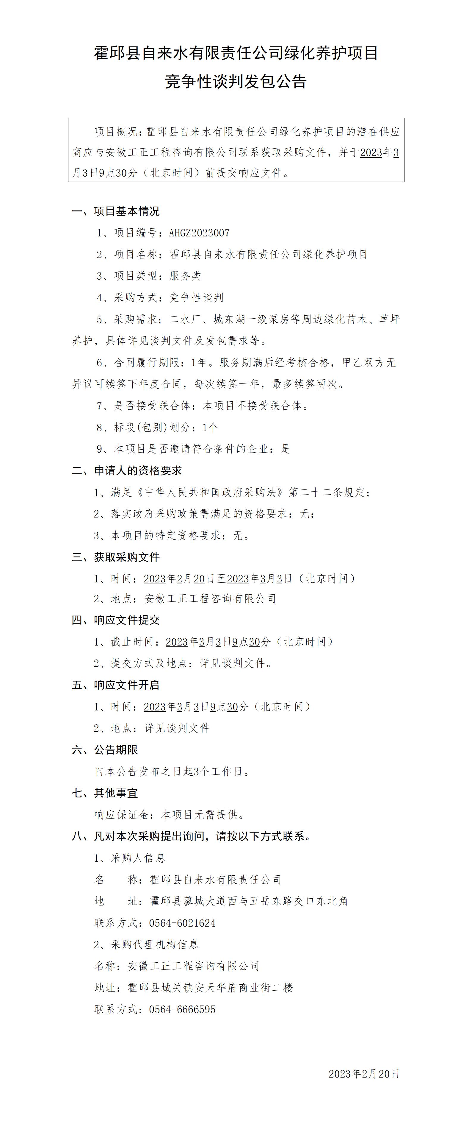 霍邱县自来水有限责任公司绿化养护项目竞争性谈判发包公告