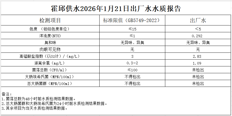 2026年1月21日出厂水水质报告