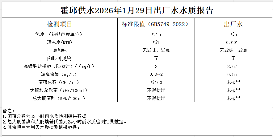 2026年1月29日出厂水水质报告