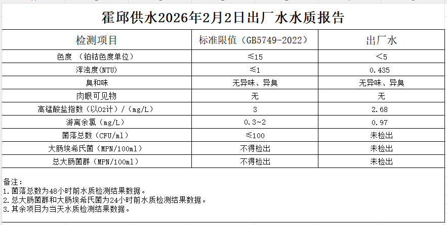 2026年2月2日出厂水水质报告