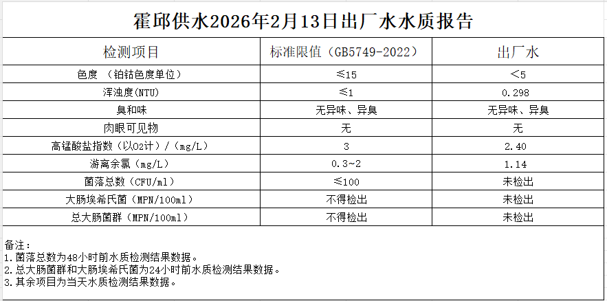 2026年2月13日出厂水水质报告