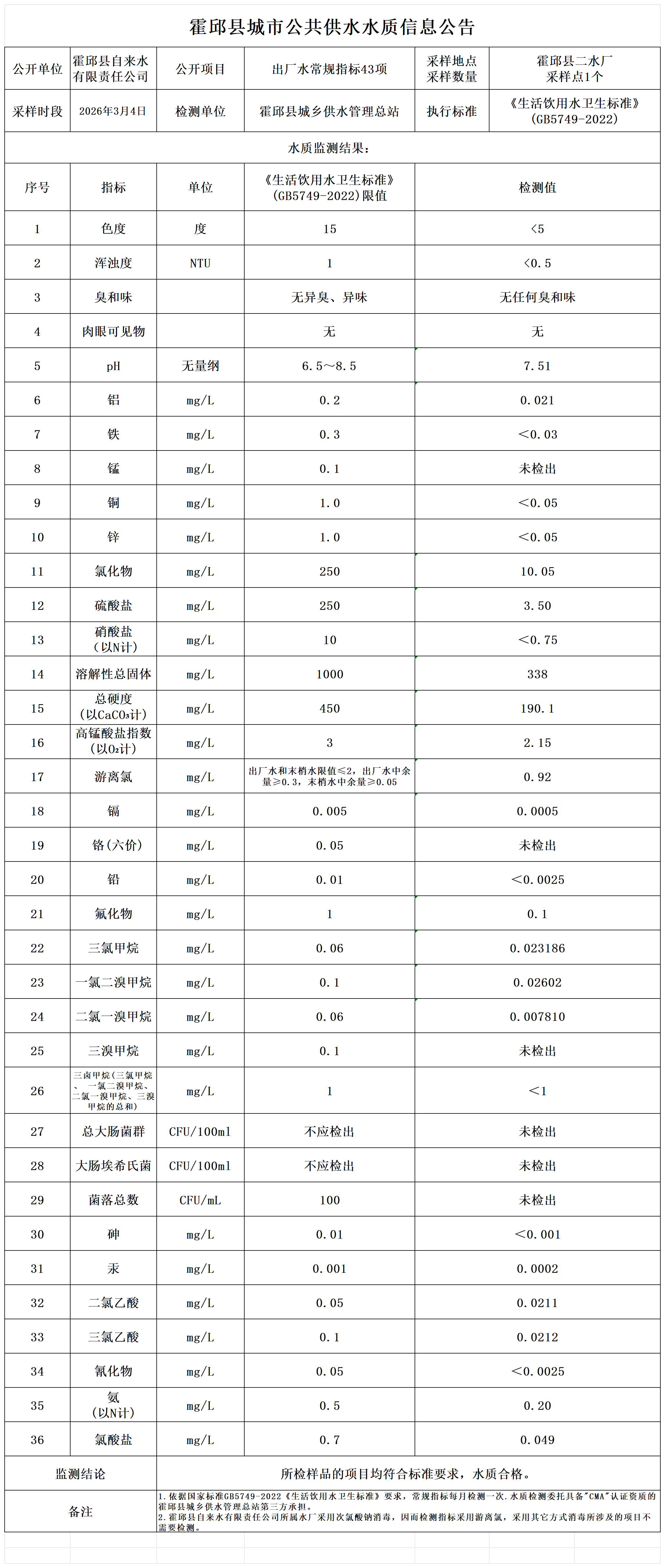 您现在的位置: 首页 - 通知公告 - 水质公告 - 出厂水水质(43项) - 2026年3月出厂水水质(...